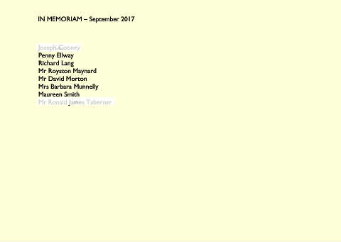 IN MEMORIAM – August 2017 Mrs Wilma Penny Anderson Mr Oswald Bailey Mrs Doreen A Cahoon Mr Russell James Stanley Fleming Mrs Elizabeth Ann Green Ms Marilyn House Mrs Ethel Lord Mr Robert Andrew Manning Mrs Jacqueline Russell Mrs Nancy Whittaker