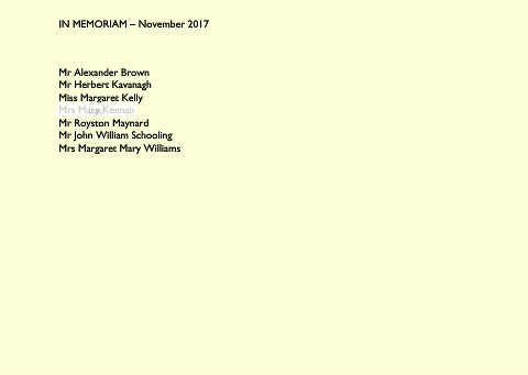 IN MEMORIAM – October 2017 Mrs Marguerite Edith Cunnington Dalton Mr 'Basil' Brain Greenwood Mr Leonard Humphreys Mr Kevin Lee Mr Jeff Michon Mr Jack Newton Mitchell Jimmy Reddington Dr Gary Walker